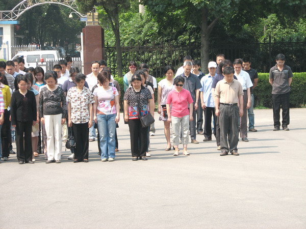 5月19日14时28分,测地所在实验大楼前广场上,为在汶川大地震中遇难的同胞集体默哀三分钟。 参加默哀活动的人员有中科院测地所许厚泽院士、原湖北省政协副主席蔡述明同志、所领导、机关管理人员、科研专家、后勤人员、在读研究生以及部分离退休职工。当汽车鸣笛的声音响起时,全场人员静静地伫立,怀着无比沉痛的心情,为在四川大地震中不幸遇难的同胞致哀。 另外,在全国哀悼日期间,测地所下半旗致哀,并停止一切文体娱乐活动,以表哀思。